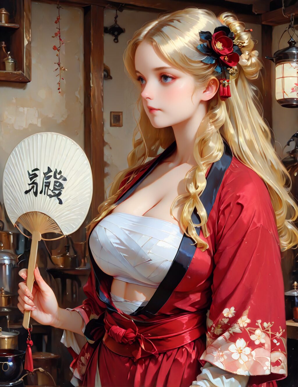 source_anime, best quality, perfect anatomy , very aesthetic , absurdres , 1girl, lady, blonde hair, long hair, japanese clothes, happi, sarashi, paper fan, hand fan, hair ornament, standing, indoors, portrait, sfw, general, oil painting \(medium\), historical art, medieval, solo, <lora:Gigantic_Renaissance_Illustrious:0.8>, bakunyu, <lora:Classic_European_and_Modern_Japonism_Artstyle_Pony:0.8>