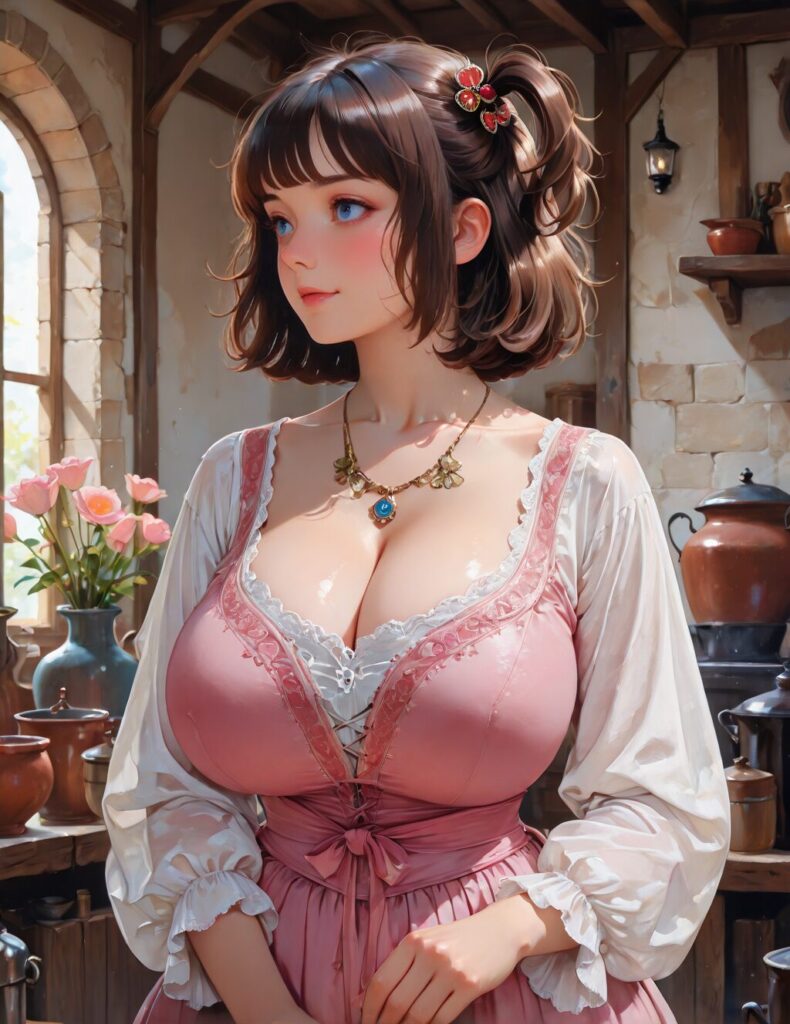 source_anime, source_realistic, photograph, rating_explicit, detailed, high quality, very aesthetic, absurdres, high resolution, 1girl, young lady, blue eyes, brown hair, medium hair, , black hair, short hair, hime cut, one side up, messy hair, hair ornament, (smile:0.5), huge breasts, (smile:0.5), medieval dress, necklace, indoor, room, flower, pot, oil painting \(medium\), renaissance artstyle,<lora:Classic_European_and_Modern_Japonism_Artstyle_Pony:0.8>