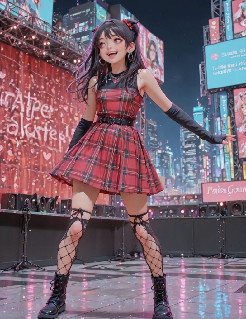 1girl,full body,,,Red_gothic_dress, sleeveless dress, red plaid, plaid pattern, pleated skirt, plaid skirt, black belt, heart-shaped buckle, hoop earrings, metal necklace, ornate necklace, red gemstone, cross pendant, gothic necklace, fishnet arm warmers, fingerless gloves,fishnet thighhighs, lace-up legwear, combat boots, black footwear,city,stage,smile,open_mouth,from side,dynamic pose,, masterpiece, best quality, amazing quality, newest,detailed face, beautiful eye <lora:red_gothicdressDIM16+_illustrious:0.7>