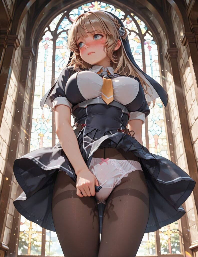 large breasts,1girl,solo,panties,cowboy shot,thigh gap,upskirt,dutch angle,from below,foreshortening,outdoors,sunlight,sunbeam,Nun wimple,lace-trimmed panties,pantyhose,panties under pantyhose,exposure panties,pantyshot,(skirt tug:1.3),landscape,upset,embarrassed,full-face blush,wind lift,church,, masterpiece,best quality,amazing quality,very aesthetic,absurdres,<lora:IL_fullback_panties:1>