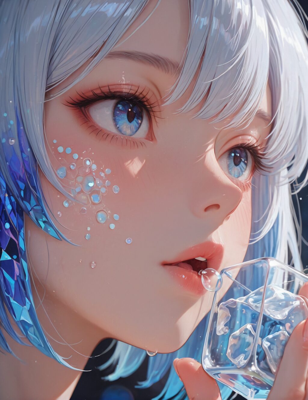 Close-up of a clear ice cube with bubbles, intricate crystal patterns, cold blue hues, studio light from behind creating a glow effect, Canon EOS 5Ds, 50mm macro lens, f/11. <lora:Better Close-Ups:1>