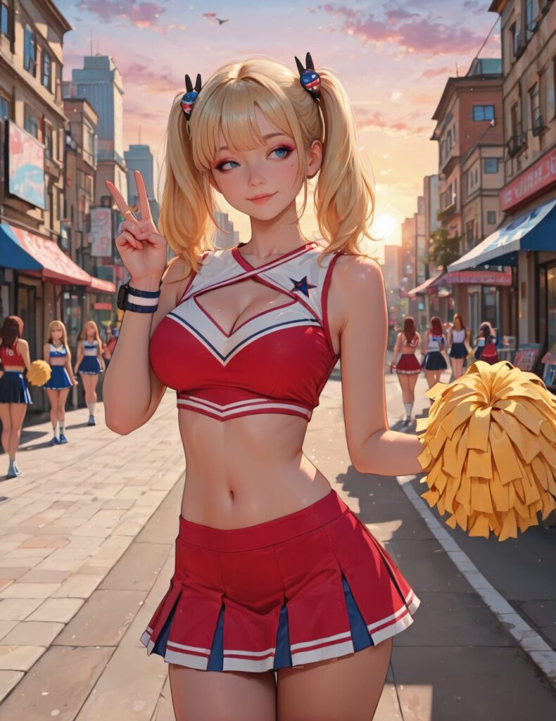 starlingxl, blue eyes, blonde hair, twintails, makeup, light smile, v, wink, cheerleader uniform, cleavage, hair ornament, navel, wristband, wristwatch, standing, looking at viewer, m, outdoors, city, evening, (insanely detailed, masterpiece, best quality), NO_LORA