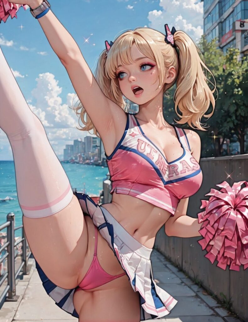starlingxl, blue eyes, blonde hair, twintails, makeup, cheerleader uniform, cleavage, hair ornament, navel, wristband, wristwatch, standing, open mouth, sparkle, looking at viewer, thighs, thighhighs, leg up, pink thong, skirt, cheering, outdoors, seascape, urban, san romero, (insanely detailed, masterpiece, best quality), , NO_LORA
