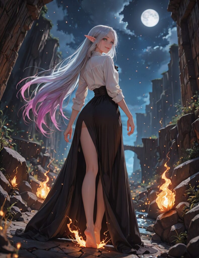 (ml)(focus on landscape :1.3)(small characters :1.3) outside florest, ( on feet standing:1.3),looking for the vier, side back view(semi realistic :1.4)big anime eyes, anime girl(super long hair:1.3) , background , detailed and high-quality, cinematic lighting, 8k, looking at viewer),Detailed,sharp image, beautiful eyes, intrecate details, highres, masterpiece, best quality, newest, absurdres,dutch angle, dynamic pose, BREAK(far from view :1.4 )(Landscape view:1.3) ,(elf) full dress, white shirt, black skirt, Subject separation, depth of field, feet deep in middle off flowers ,, green eyes, hair, large thighs,(), smiling, glowing fire powers above head , in night pretty hair, beautiful face, serious eyes looking, Lighting shades,(magic particles floating :1.4) . A glowing purple and blue power coming from the moon. Creating a cilinder effect of power <lora:Landscape_character:1>