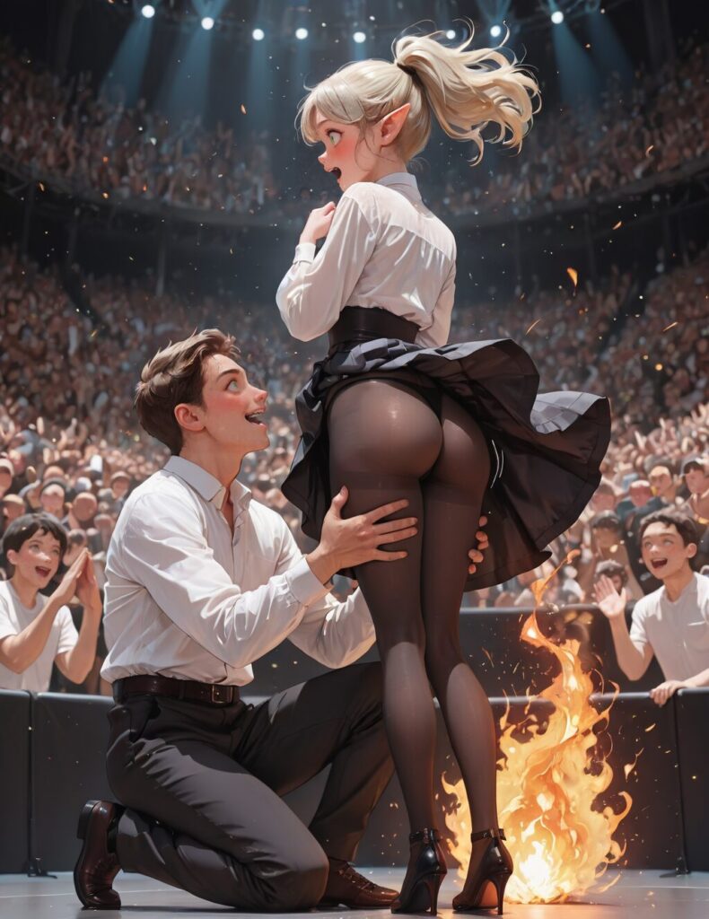 ml,focus on landscape,small characters, hetero, perspective,(motion lines, motion blur:1.2), (black pantyhose,pantyshot, thong under pantyhose,ass,skirt lift,floating skirt:1.3), looking back, surprised, open mouth, looking to the side,embarrassed, blush, (elf), full dress, white shirt, black skirt, green eyes, hair, glowing fire powers above head, beautiful face, (magic particles floating) . 1man, on one knee with both arms straight to forward and palms facing upward, lifting another's skirt, profile, from side, looking ahead, evil grin, wide-eyed, excited, blush, arms up, hands up, full body, arms spreading,knight, armor, in Giant round Square, standing on stage, the crowd below cheers, depth of field, <lora:Landscape_character:1>