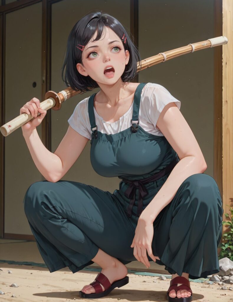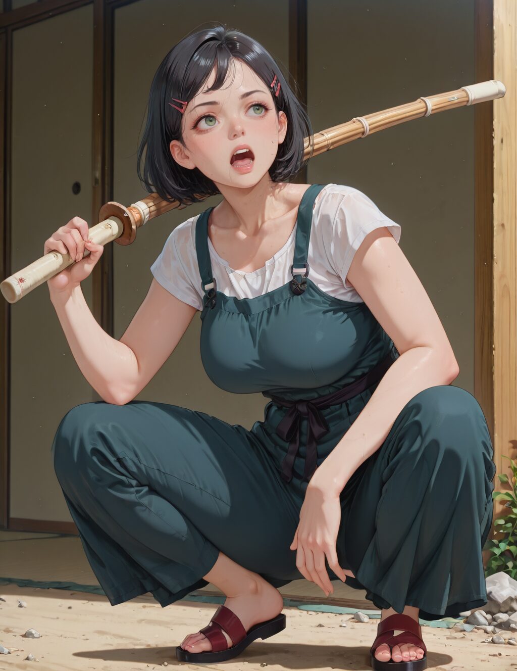 masterpiece, best quality, amazing quality,, short hair, black hair, hair ornament, hairclip, green eyes, mature female, breasts, anime screencap,, slav squatting, solo, looking at viewer, open mouth, holding, weapon, teeth, sword, holding weapon, holding sword, squatting, over shoulder, weapon over shoulder, wooden sword, shinai, bokken, <lora:slav-squatting-illustriousxl-lora-nochekaiser:1>