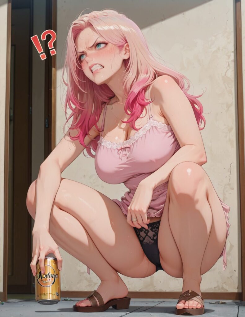 masterpiece, best quality, amazing quality,, long hair, pink hair, multicolored hair, aqua eyes, mature female, breasts, anime screencap,, <lora:slav-squatting-illustriousxl-lora-nochekaiser:1>, slav squatting, solo, looking at viewer, blush, full body, teeth, squatting, clenched teeth, angry, can, !?, drink can, holding can, <lora:slav-squatting-illustriousxl-lora-nochekaiser:1>black panties,