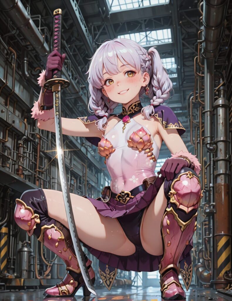 masterpiece, best quality, amazing quality,, 1girl, solo, blush, leotard, light purple hair, yellow eyes, purple pleated kama skirt, armored greaves, twintails, braid, pink fur trim, small breasts, anime screencap,slav squatting, solo, looking at viewer, smile, gloves, holding, full body, looking at viewer, katana, holding Sword,, industrial, machinery, metal, large, factory, cowboy shot, solo, <lora:slav-squatting-illustriousxl-lora-nochekaiser:1>
