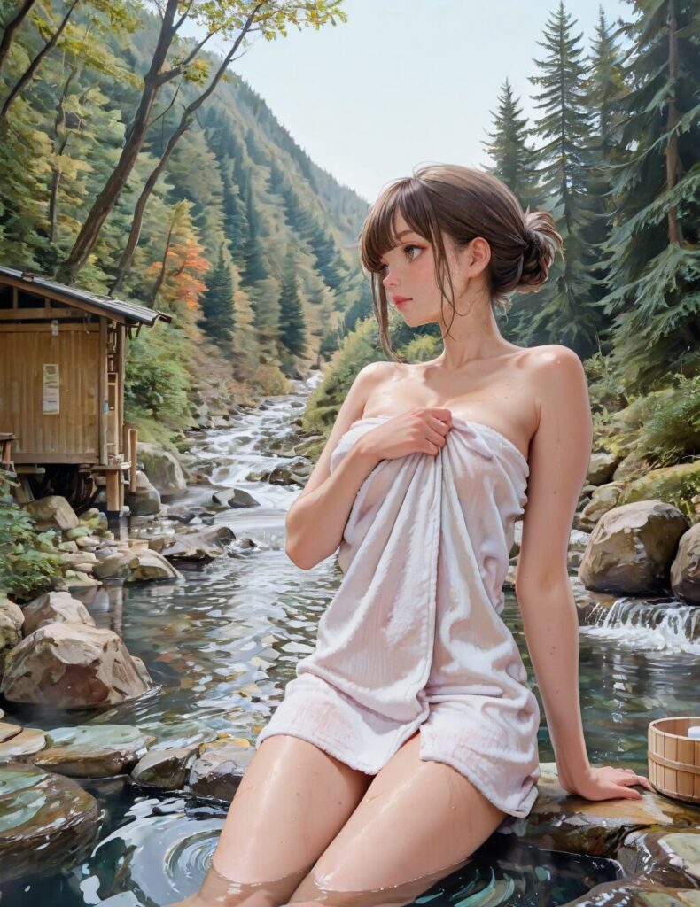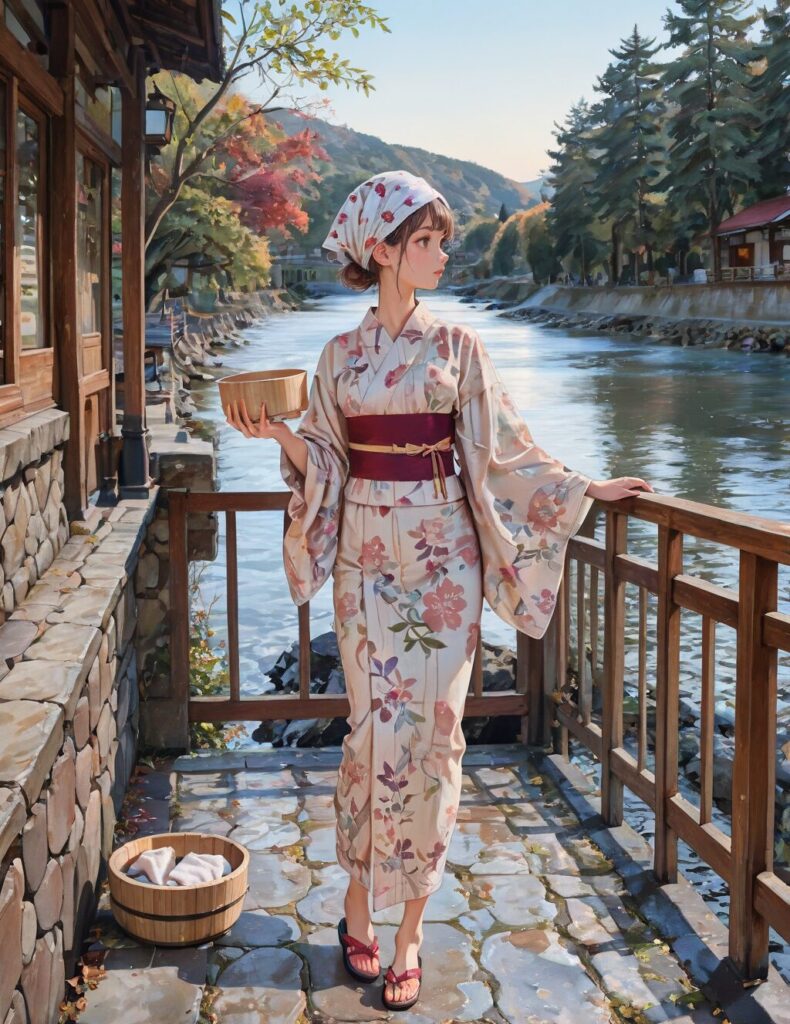 | Trigger: | noyu yukata, haori, jacket, sandals, geta, wooden washbowle, hand towel, tenugui, outdoors, onsen, bathing, partially submerged, scenery, mountain, nature, day, rock, steam, tree, sky, river, grass, landscape, forest, sunlight, waterfall, building, shed, house, parasol, plant, window, wooden fence, bench, east asian architecture, lantern, |