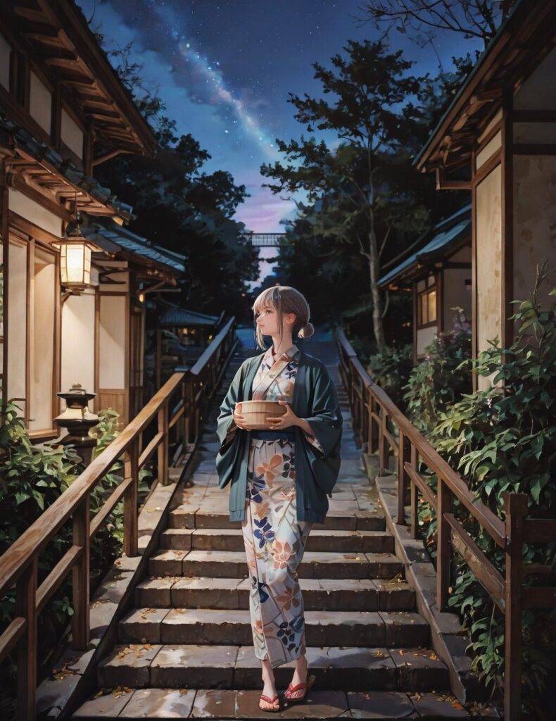official art, noyu, 1girl, solo, night, stairs, tree, solo, 1girl, scenery, outdoors, sky, haori, jacket, yukata, railing, holding, wooden washbowl, (masterpiece:1.3), best quality, high resolution, unity 8k wallpaper, extremely detailed CG, 8K, (watercolor \(medium\), muted color, sketch:1.1), perfect anatomy, highly finished, masterpiece, best quality, high quality, amazing quality, great quality, very aesthetic, ultra detailed, highres, absurdres, highly detailed, highly detailed background,<lora:noyu:0.6>