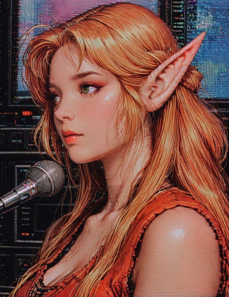 1girl, solo, alone, elf, pointy ears, <lora:crt_tv_game_style_illustriousXL:1.2>crt_tv_game_style, scanlines