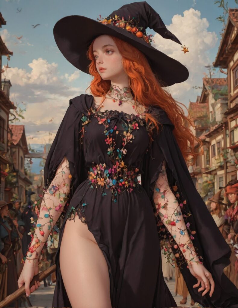 1girl,witch,detailed background,cowboy shot,r3na1ssanc3,, best quality,high quality,extremely detailed,8K HD,Subsurface scattering,epic,hdr,intricate details,8k,(hyperdetailed:1.2),(vivid colors:1.2),better shadows <lora:Renaissance Style_rank16_fp16:1>
