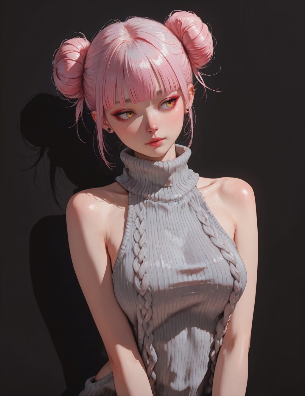 embedding:lazypos, embedding:cr1sp, ,, 1girl, bangs, black background, blunt bangs, cross, double bun, ear piercing, eyeliner, face, glowing, makeup, meme attire, pink hair, ribbed sweater, short hair, simple background, stud earrings, sweater, turtleneck, turtleneck sweater, virgin killer sweater, yellow eyes, masterpiece, best quality, very aesthetic, bold outlines, strong shadows, high contrast, crisp lines, detailed, intricate, ultra detailed, vibrant, smooth gradients, subtle shadows, professional, high-resolution, perfect lighting, solo, depth, complex lighting, ultra detailed , <lora:type_of_nose_slider_illustrious_v1.0:-1>