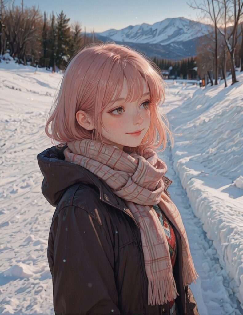 , 2dReal, ((photo background, film grain)), 1girl,snow, dark, upper-body, light smile, looking at viewer, blurry background, depth of field, landscape,impressionism, <lora:2dRealPhoto_Background:1>