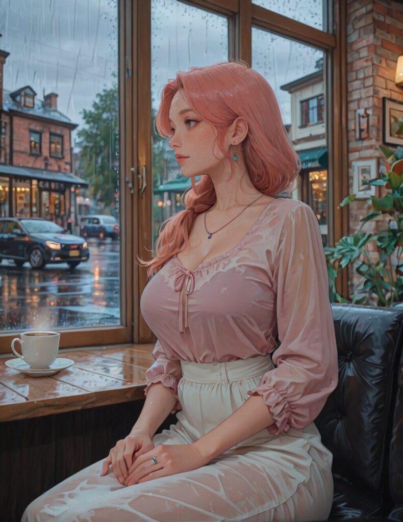 2dReal, (photo background:1.4), ((film grain:1.4)), 1girl, aged_up,mature female, tall_female, cafe, sitting, blurry background, depth of field,impressionism, window, rain, <lora:2dRealPhoto_Background:1>