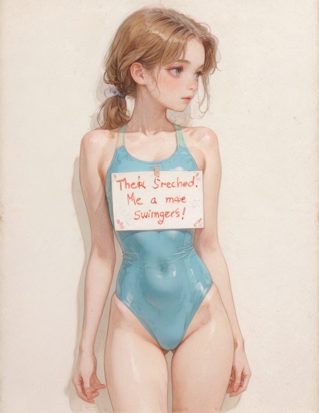 A young woman holding a sign. (text: "Vintage Drawing"). soft color pencil drawing. swimsuits<lora:VintageDrawing01-00_CE_SDXL_128OT:1.1>