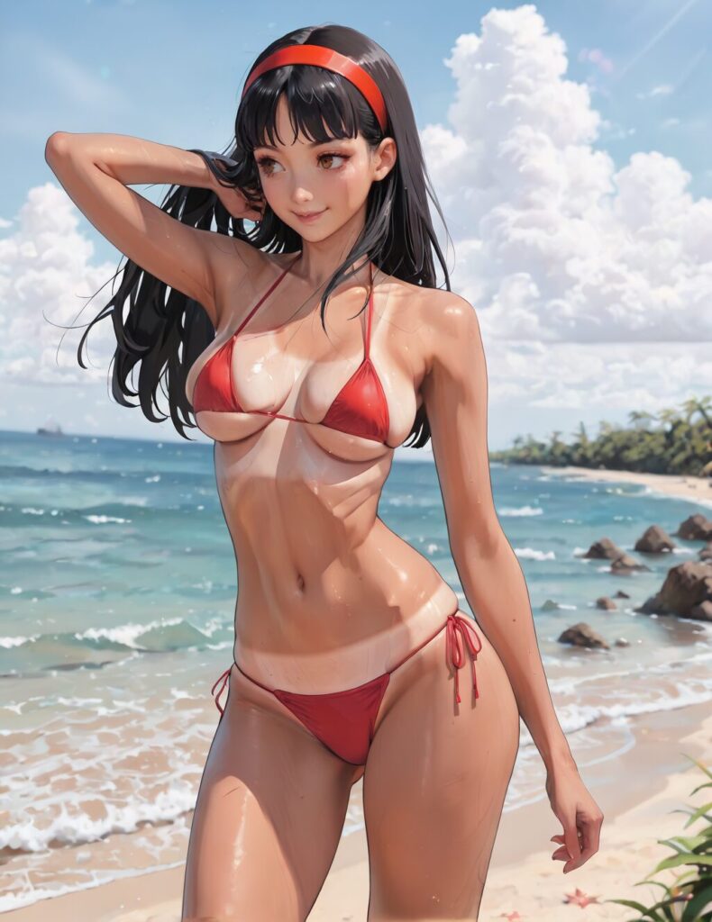 masterpiece, best quality, amazing quality, absurdres, 1girl, solo, black hair, brown eyes, tan, tanlines, micro bikini, string bikini, standing, looking at viewer, smile, outdoors, ocean, beach, dynamic pose, skindentation, detailed clothing folds, depth of field, sharp, high contrast, dynamic light<lora:Track_Uniform_Tan_Lines_01_ill_v12:1>