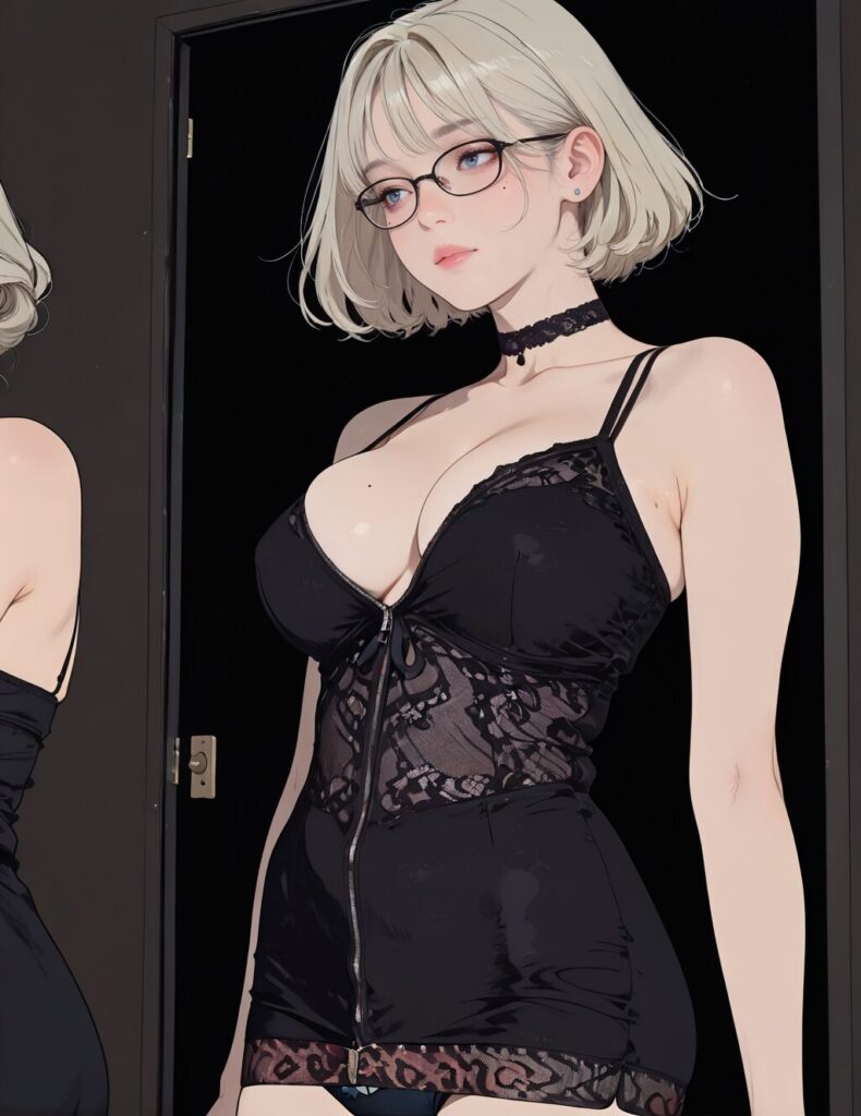 masterpiece,best quality,amazing quality,very aesthetic,high resolution,ultra detailed,perfect details,anime coloring, 1girl,mai_black_dress,black_panties,black_dress,choker, mature female,short hair,platinum blonde hair,mole under eye,blue eyes,beautiful detailed eyes,larg breasts,oval face,glasses, <lora:mai_black_dress:0.7>