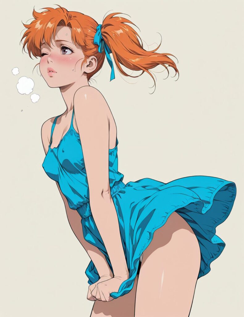 (Anime lineart, urushihara satoshi:0.6), masterpiece, anime wallpaper, CG, official art, porn quality, highest quality anime, hentai art, anime lineart, illustration, best quality, absurdres, highres, detailed background, <lora:hyperSD8:1>, high quality,, break, face focus, solo, 1girl, Artist iwao178, BREAK, bleach, (adult female), orange hair, side ponytail, small breasts, lips,lips, bare shoulders, blush, blushing, beautiful, detailed, angled, cartoon, small breasts, heavy breathing, FLY1NG5K1RT, thighs, dress, dress lift, dress tug, standing, wind, wind lift, marilyn monroe (cosplay), ((blue dress)), sleeveless, sleeveless dress, one eye closed, Simple background<lora:checkpoint-e26_s702-1:1>