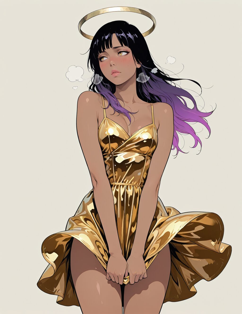 (Anime lineart), masterpiece, anime wallpaper, CG, official art, porn quality, highest quality anime, hentai art, anime lineart, illustration, best quality, absurdres, highres, detailed background, <lora:hyperSD8:1>, high quality, face focus, solo, 1girl, Artist iwao178, BREAK, bleach, (adult female), black hair, gradient hair, purple hair, (yellow eyes:1.2, slit pupils), long hair, purple hair, bangs, halo, breasts, dark skin, dark-skinned female:1.2, lips,lips, bare shoulders, blush, blushing, beautiful, detailed, angled, cartoon, small breasts, heavy breathing, FLY1NG5K1RT, thighs, dress, dress lift, dress tug, standing, wind, wind lift, marilyn monroe (cosplay), ((gold dress)), sleeveless, sleeveless dress, one eye closed, Simple background, <lora:checkpoint-e26_s702-1:1>