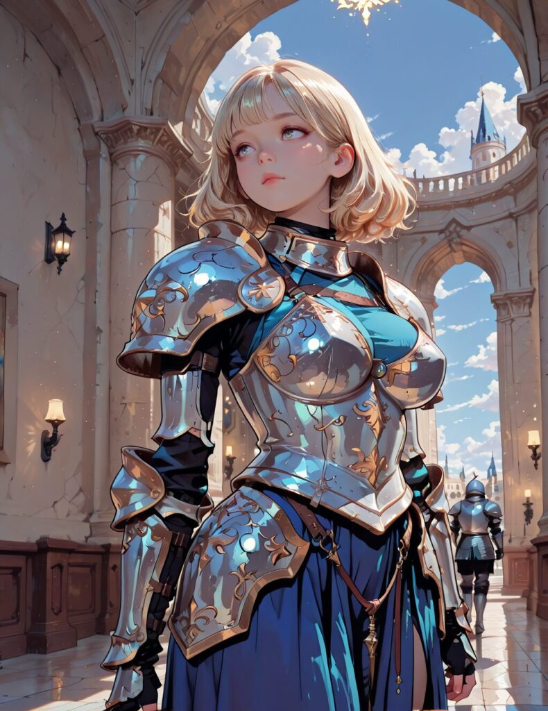 masterpiece, best quality, bright colors, 1girl, s-arm, knight armor, large breasts, young, round face, blonde hair, indoors, palace, sky, cloud, lights, glow, luminous, <lora:s-arm:0.7>