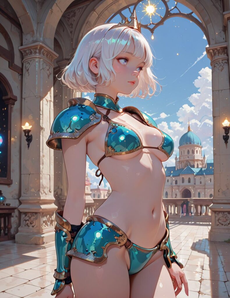 masterpiece, best quality, bright colors, 1girl, s-arm, bikini armor, medium breasts, young, round face, white hair, indoors, palace, sky, cloud, lights, glow, luminous,, <lora:s-arm:0.7>