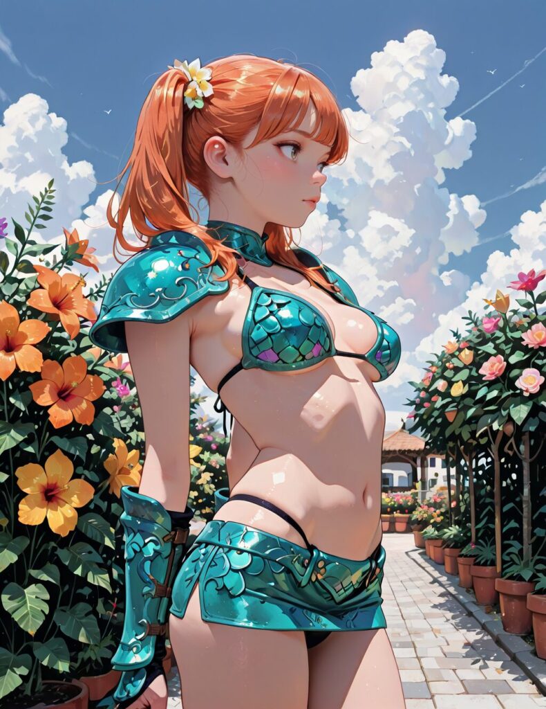 masterpiece, best quality, bright colors, 1girl, s-arm, bikini armor, micro-mini skirt, panties, medium breasts, young, round face, orange hair, twintails, outdoor, garden, tropical flowers, sky, cloud, <lora:s-arm:0.7>