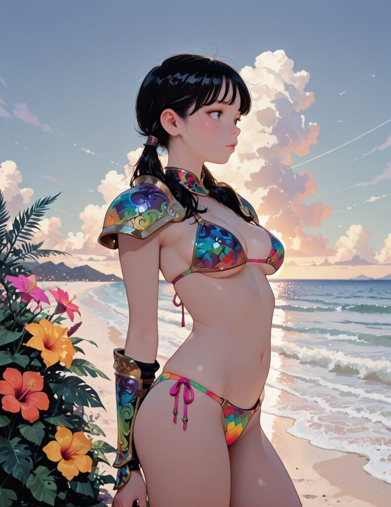 masterpiece, best quality, rainbow colors, bright colors, 1girl, s-arm, bikini armor, medium breasts, young, round face, black hair, low twintails, bangs, outdoor, seaside, tropical flowers, sky, cloud,<lora:s-arm:0.7>