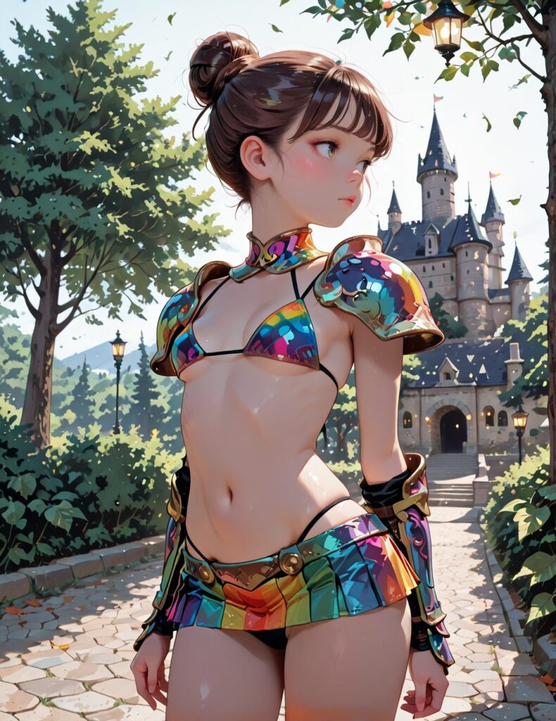 masterpiece, best quality, rainbow colors, bright colors, 1girl, s-arm, bikini armor, micro-mini skirt, panties, small breasts, young, round face, brown hair, hair bun, bangs, outdoor, castle, lights, leaves, tree,<lora:s-arm:0.7>