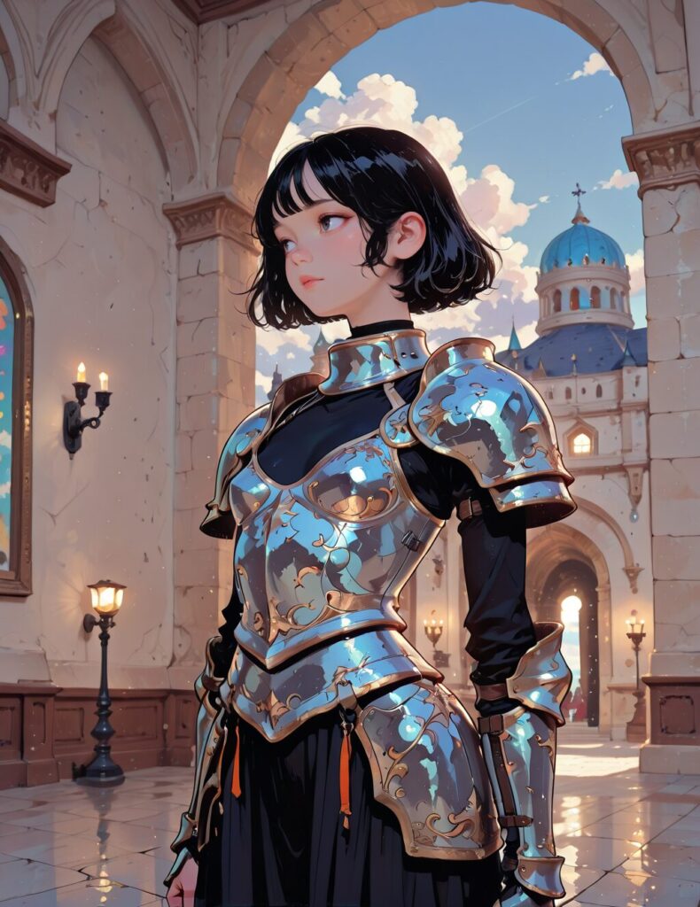 masterpiece, best quality, bright colors, 1girl, s-arm, knight armor, small breasts, young, round face, black hair, indoors, palace, sky, cloud, lights, glow, luminous,<lora:s-arm:0.7>