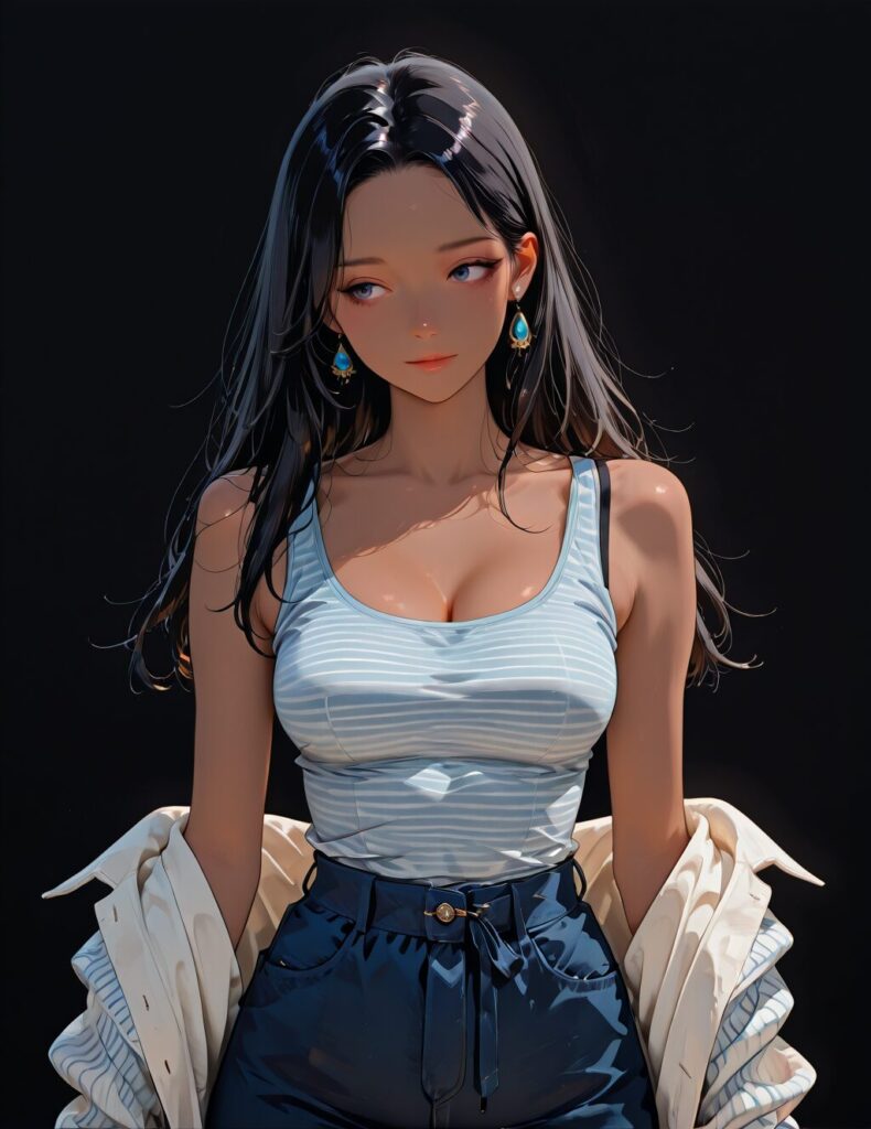 lazypos, black_background, BREAK, wide shot, BREAK, standing, , BREAK, hpkyanna1, dark skin, blue tank top, striped shirt, BREAK, solo, BREAK (soft morning light:1.2), BREAK, looking at viewer, happy<lora:pudb_hpkyanna1:0.8>
