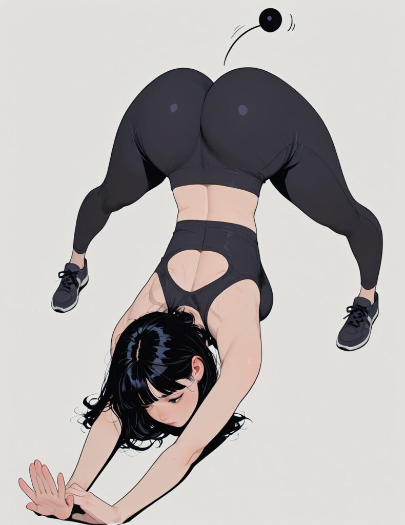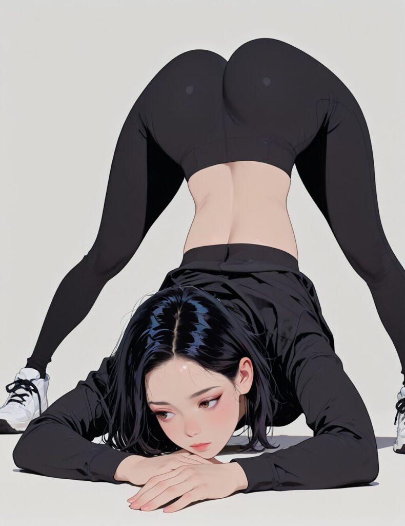 pearlyyph, stretching, ass up head down, split, pearlyblo masterpiece, high_quality, highres, 8k, best quality, highly detailed, (lineless:1.2), BREAK adult, detailed face, cinematic angle, solo, full body, from above, BREAK cute, adorable, stretching,split, upside down, <lora:Pearly_yoga_pose_helper__illustrious:1>