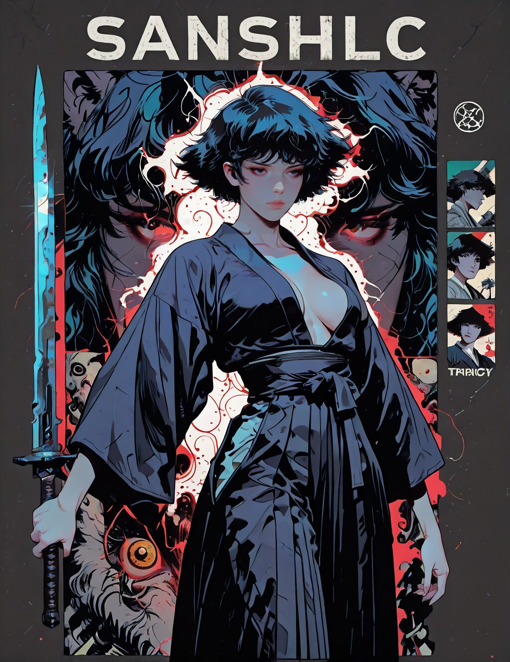 HDR, raytracing, pathtracing, realistic shadows, masterpiece, best quality, newest, absurdres, highres, 1girl, a woman with blue hair holding a sword, style of akira motion movie, promotional art, vhs cover, spike spiegel, grim - wolf, wearing hakama, breasts covered and sfw, dark blue color, baki style, mapo tofu, portrait, poster, cover, <lora:Poster_boy:1>