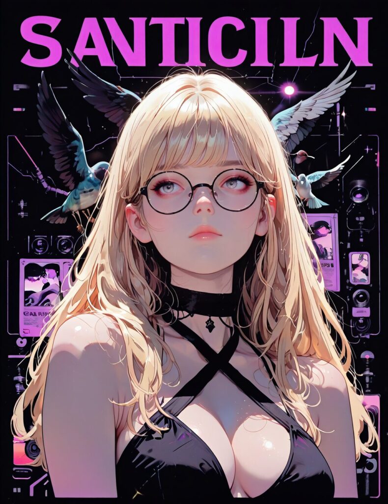 HDR, raytracing, pathtracing, realistic shadows, masterpiece, best quality, newest, absurdres, highres, 1girl, solo, glasses, blonde hair, looking at viewer, long hair, breasts, upper body, grey eyes, closed mouth, bird, clothing cutout, criss-cross halter, round eyewear, halterneck, cleavage, black-framed eyewear, lips, medium breasts, purple lighting, poster, cover,<lora:Poster_boy:1>