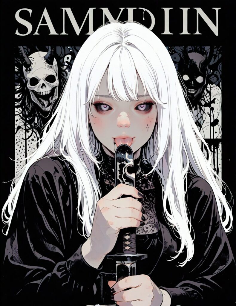 horror-themed HDR, raytracing, pathtracing, realistic shadows, masterpiece, best quality, newest, absurdres, highres, girl, white hair, long hair, white eyelashes, pretty face, tongue, small tongue, drool, black nails, drooling, detailed eyes, pale purple eyes, (black sclera of the eye:1), pale skin, rosy cheeks, samurai sword in hand, holding a sword, fighting stance black clothes, dark background, monochrome colors, (black palette), (white palette), [gray palette], high quality, high detail, masterpiece, manga, illustration, high contrast, halftone shading, dark theme, gothic style, dark theme, cinematic composition, ink-like shadows, dynamic composition, perspective, detailed background, dynamic pose, masterpiece, best quality, good quality, newest, highres, volumetric lighting, detailed, hatching, black blood splashes, demon, poster, cover,<lora:Poster_boy:1>