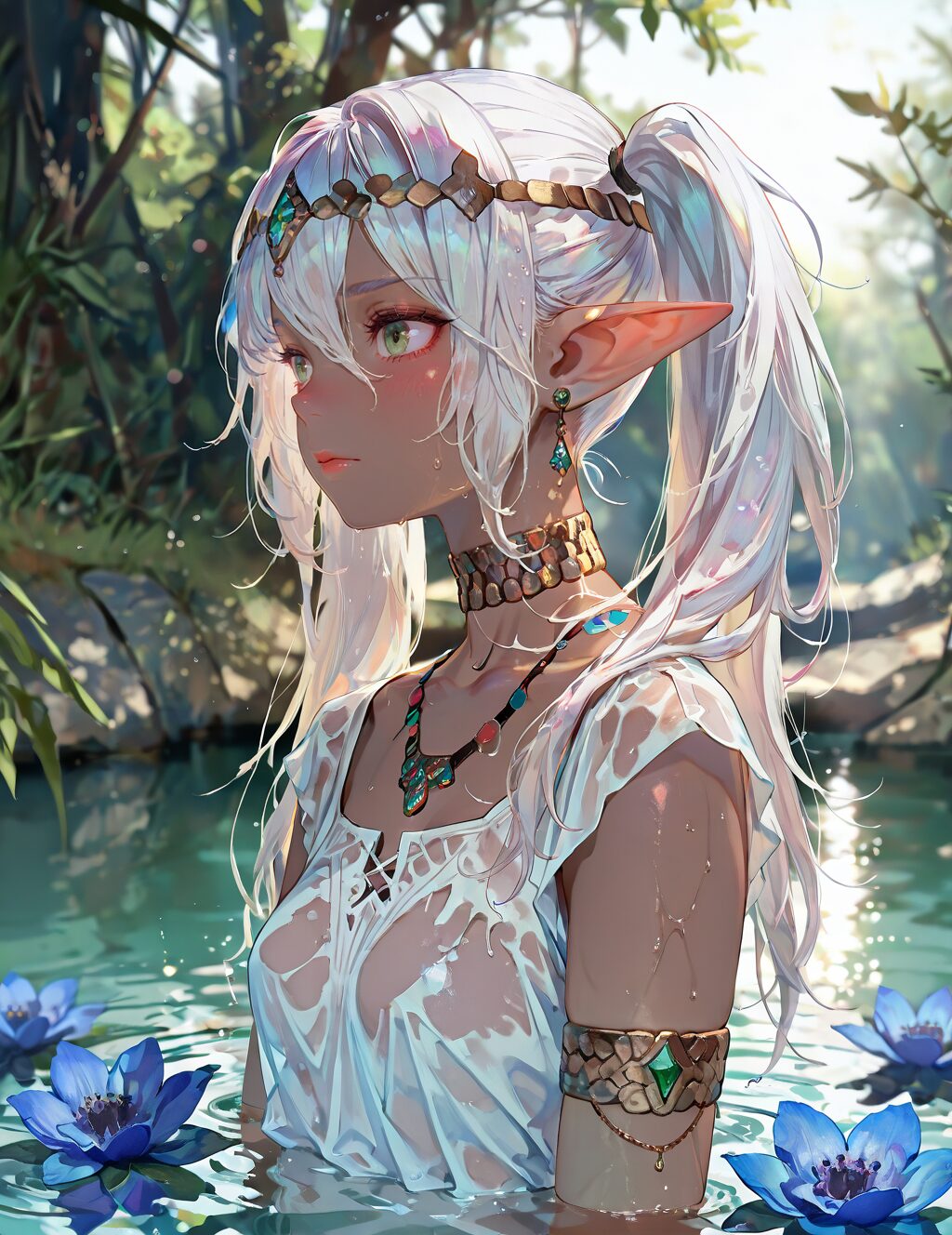 artist:[lack|fuzichoco|lam \(ramdayo\)|quasarcake], dark elf, 1girl, earrings, twintails, white hair, pointy ears, blush, solo, armlet, long hair, jewelry, outdoors, partially submerged, wet clothes, looking at viewer, necklace, wet, depth of field, closed mouth, collarbone, ripples, sunlight, circlet, green eyes, head chain, neck ring, hair between eyes, blue flower, from side, absurdres, masterpiece, best quality, very aesthetic , NO_LORA