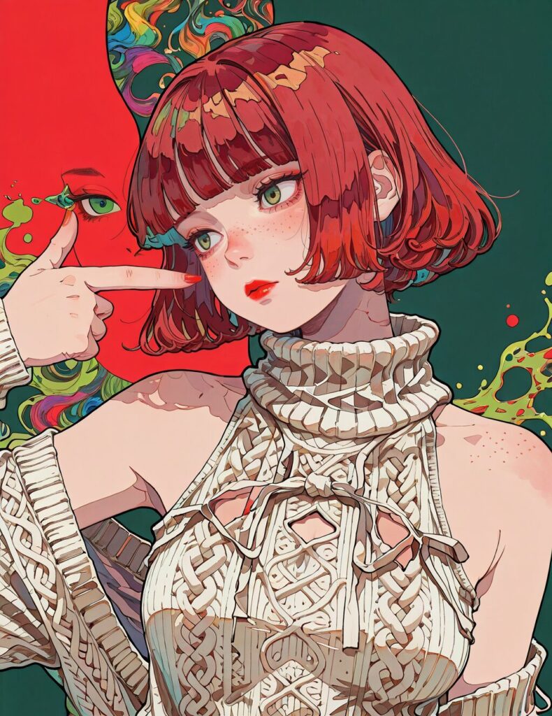 ligne claire, original, artist:[artdroiiid ii|cogecha|seraphitalg|xtango|yu yin], 1girl, solo, aran sweater, virgin killer sweater, clothing cutout, 1girl, green eyes, eyes visible through hair, freckles, lipstick, fringe, short hair, red hair, bangs, hime cut, blank stare, smeared lipstick, head tilt, finger gun to head, watercolor effect, looking away, white sweater, patterned background, unmoving pattern, green background, red background, split theme, liquid hair, traditional media, colored pencil \(medium\), colorful, absurdres, masterpiece, best quality, very aesthetic, NO_LORA