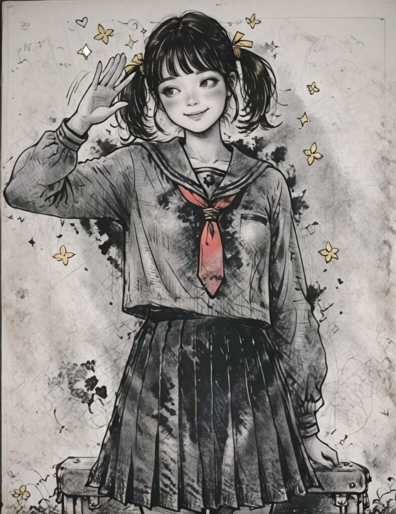 1girl, solo, textured paper, monochrome, vintage aesthetic, pencil sketch, anime style, anime girl, schoolgirl, japanese school uniform, smiling, waving hand, bangs, twin tails, yellow ribbon, blush, short hair, heerful, friendly, cute, red necktie, Sakuko Igarashi, diarysketch <lora:SILENT_HILL_f__Diary_art_style:1>