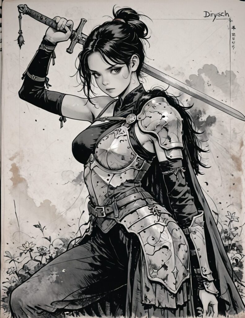 best quality, masterpiece, sfw, n0m0, diarysketch, textured paper, monochrome, vintage aesthetic, pencil sketch, anime style, close-up shot, view from aside, solo, holding sword, dynamic fighting pose, 1girl, sabia, human, folded ponytail, armor, single shoulder armor, cape, single bare shoulder, clothed, large breasts, looking at viewer, closed mouth,<lora:SILENT_HILL_f__Diary_art_style:0.8>
