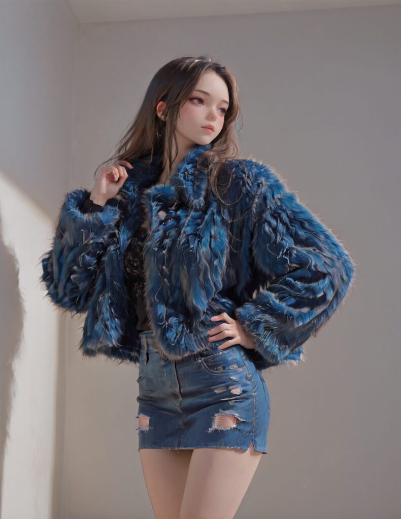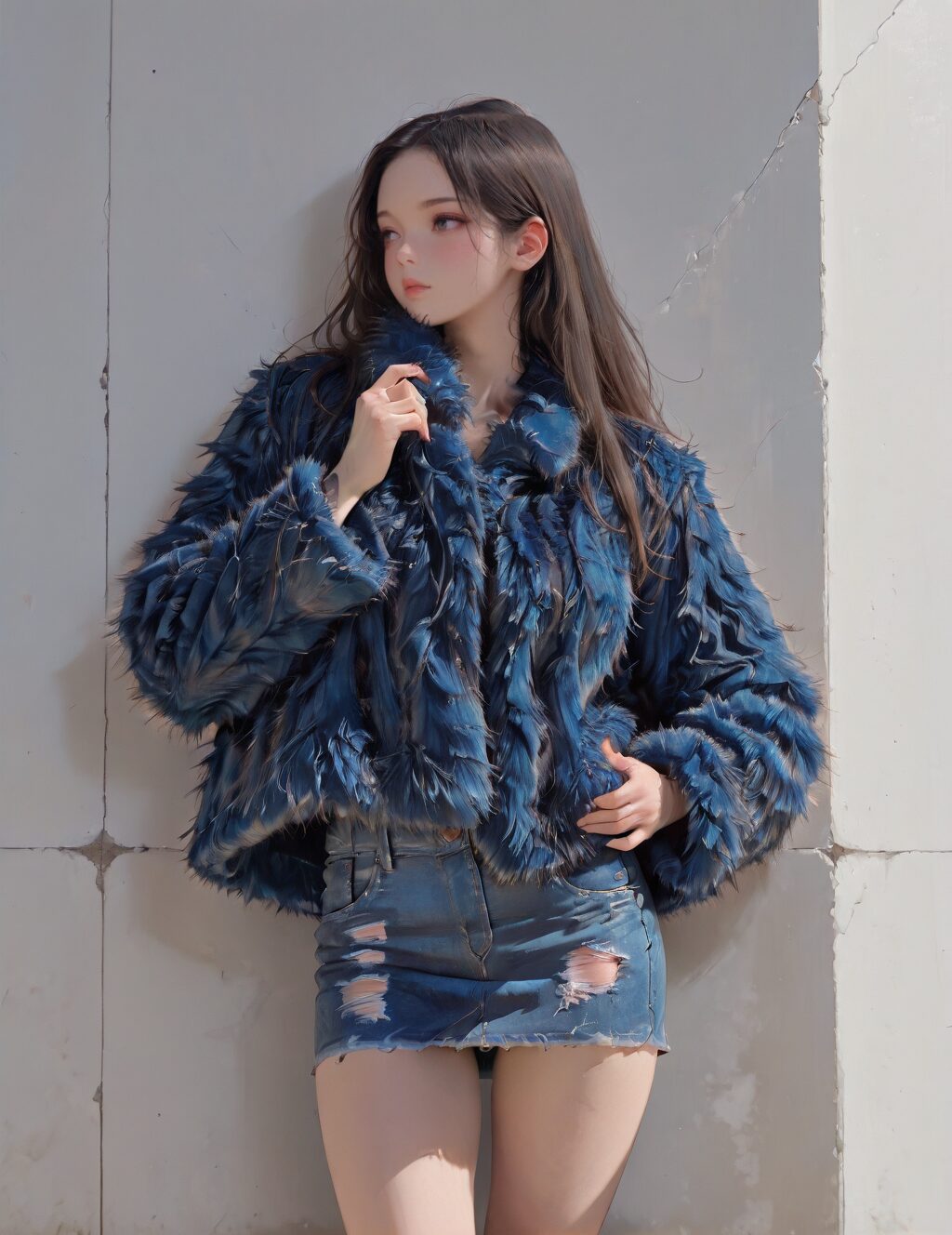 masterpiece, best quality, newest, 1girl, solo, fur coat, blue coat, denim skirt, <lora:Y2KBlueFurJacketILL:0.6>