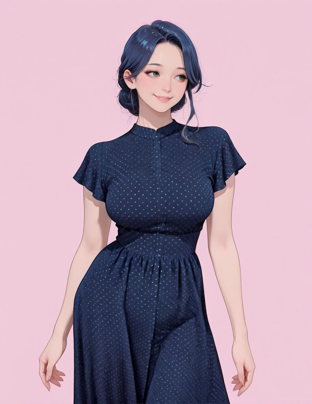 dark blue dress, polka dot dress, short sleeves,, IllusP0s, 1girl, solo, simple background, pink background, standing, cowboy shot, facing viewer, contrapposto, smile, Tapered Sides with Messy Top, Dark blue hair, green eyes, mature female, medium breasts, <lora:navybluepolkadotdressV2:0.8>