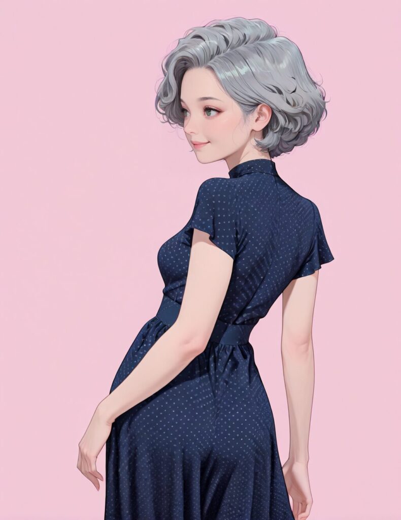 dark blue dress, polka dot dress, short sleeves,, IllusP0s, 1girl, solo, simple background, pink background, standing, cowboy shot, from behind, looking back, contrapposto, smile, Afro, Silver Gray Ombre hair, green eyes, mature female, small breasts <lora:navybluepolkadotdressV2:0.8>