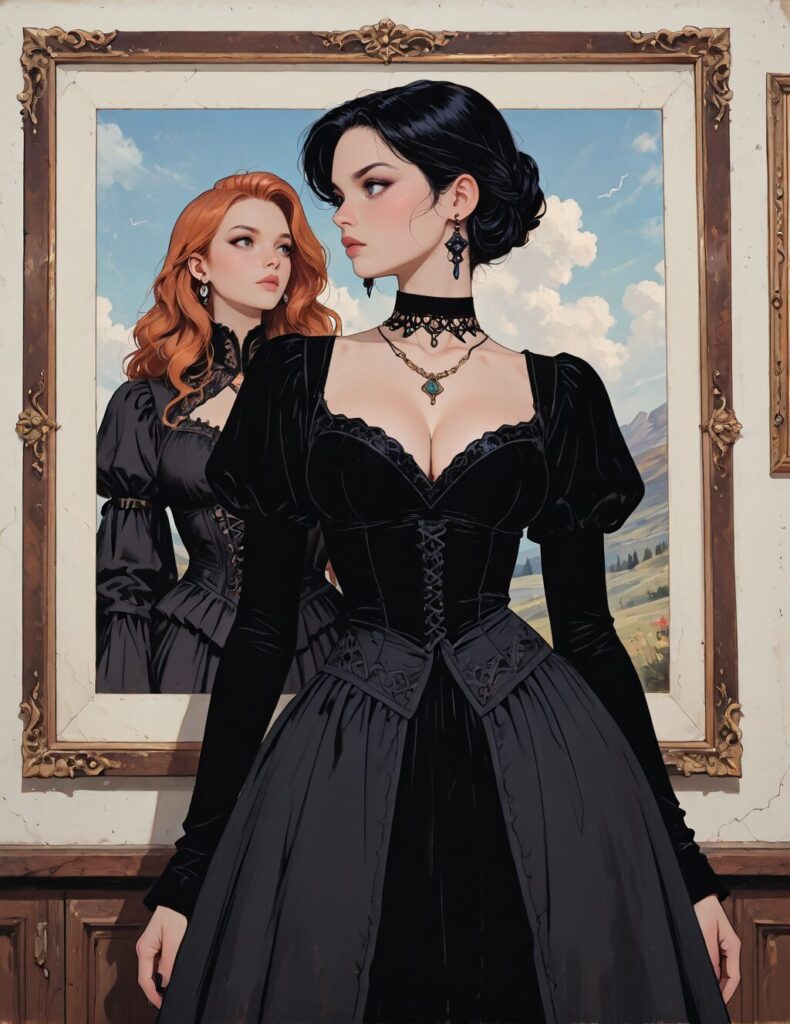 <lora:CB-Gothic:1>,Charlie Bowater,gothic art,jewelry,detailed,medium breasts,trending,cleavage,black dress,earrings,necklace,dark fantasy art,, pronpt ., masterpiece, best quality, absurdres, .,Alexandre Cabanel style,painting,background, <lora:Alexandre Cabanel Style:1>