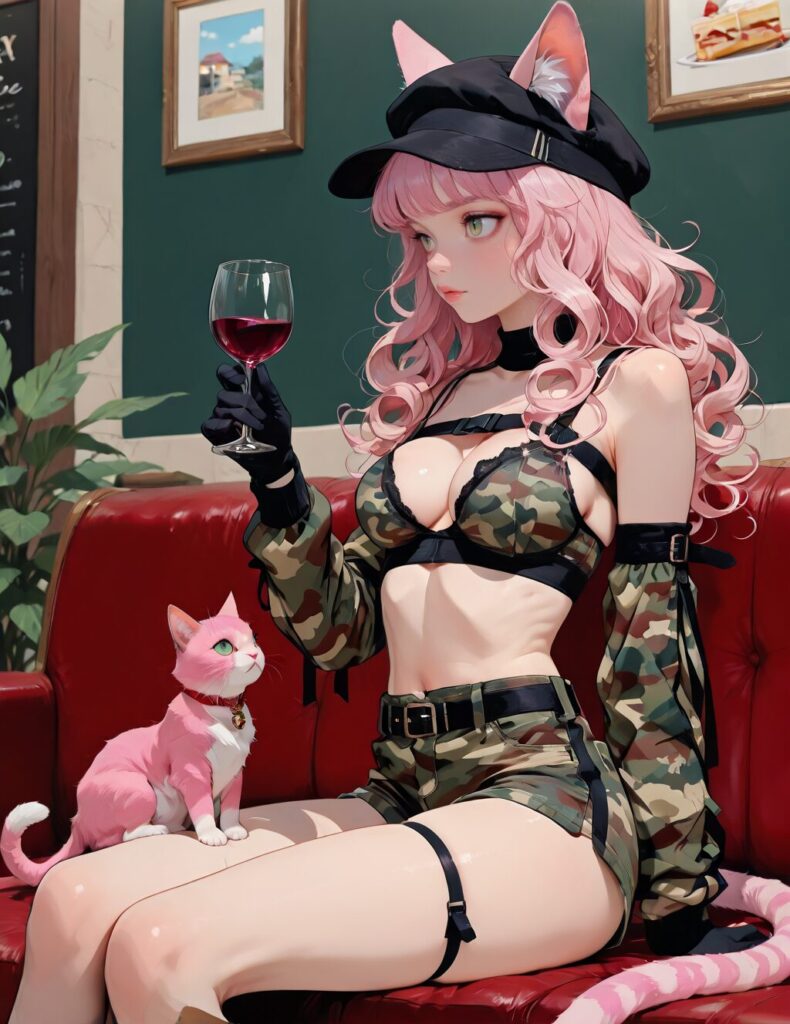 1girl, skinny, medium breasts, pink cat tail, pink cat ears, long hair, curly hair, pink hair, green eyes, slit pupils, cafe, holding wine, sitting on sofa, camouflage print, bra, detached sleeves, long sleeves, gloves, straps, camouflage, short shorts, malemilclothes, hat, masterpiece,best quality,amazing quality, <lora:lmia4IL-style:0.8>, llmia4, <lora:Military_Dance_suit:1>