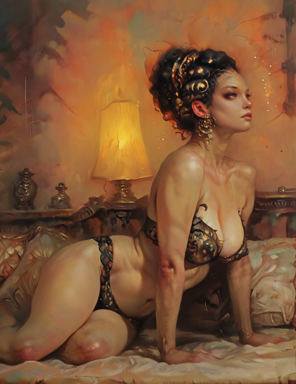 masterpiece, best quality, amazing quality, traditional_media, oil_painting_\(medium\), painting \(medium\), 1girl, massive_breasts, mature_female, solo, confused, lying_on_side, Three quarter view, Magenta lace_trims, short_hair, cornrows, blonde_hair, hotel_room, Cropped head, <lora:patrick_j_jones:1>