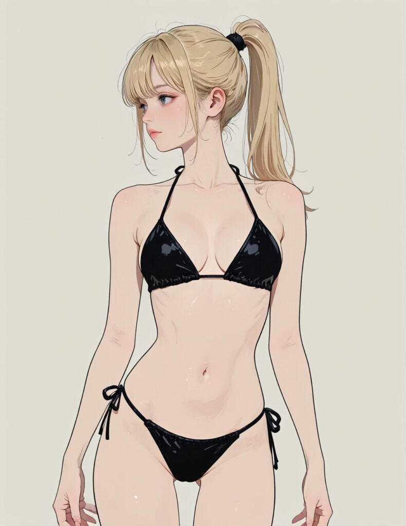 Semi-realism, artist:moriimee, jsyu_style, 748cmstyle, (1girl, solo, masterpiece, best quality, amazing quality, absurdres, newest), simple background, BREAK, high ponytail, blonde hair, black bikini, cowboy shot, standing, pose, thigh gap<lora:thigh_gap:-1>