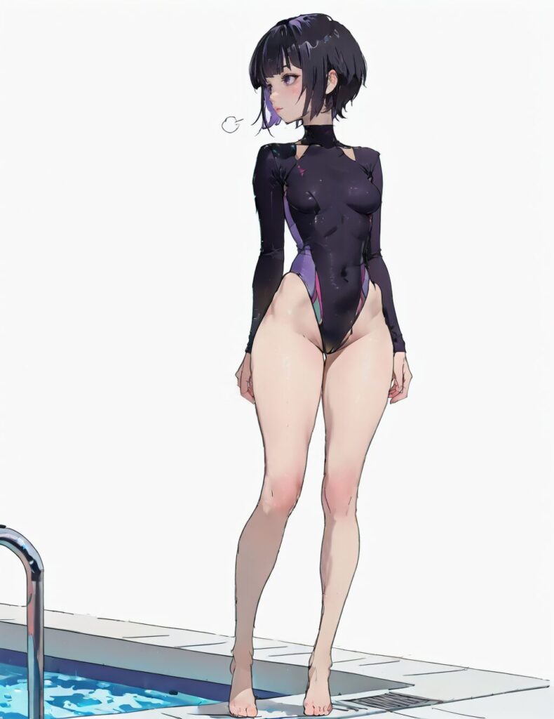 best quality, good quality, 1girl, solo, poolside, full body, standing, facing forward, front view, athletic leotard, small medium breast, <lora:Highleg_XL_Ilst:-2>