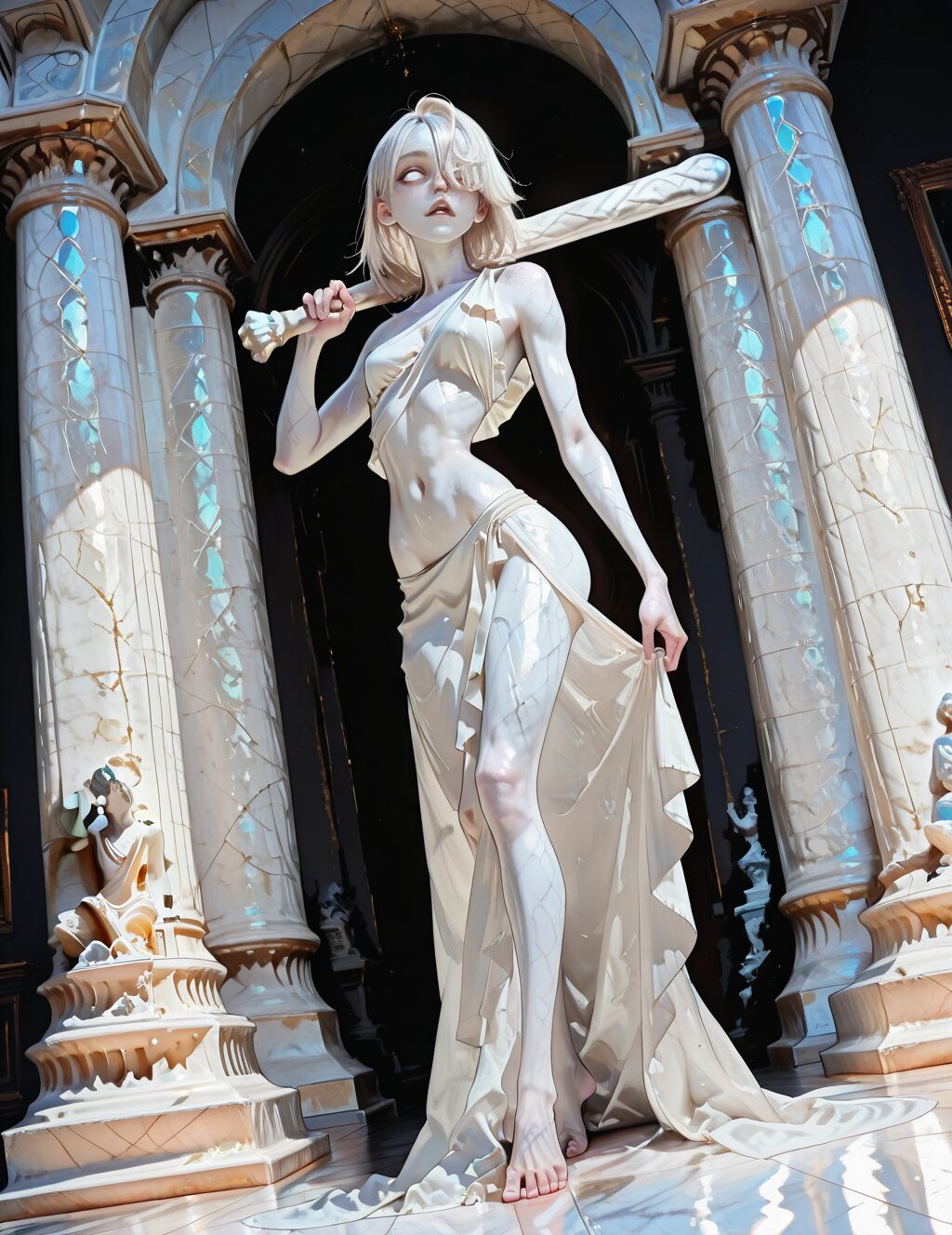 | Trigger: | white hair, smooth hair, hair over one eye, white eyes, no pupils, white skin, granite skin, marble statue boy, sculpture, boy made of stone, toga, white greek clothes, draping white stone toga, over shoulder, draping clothes, |