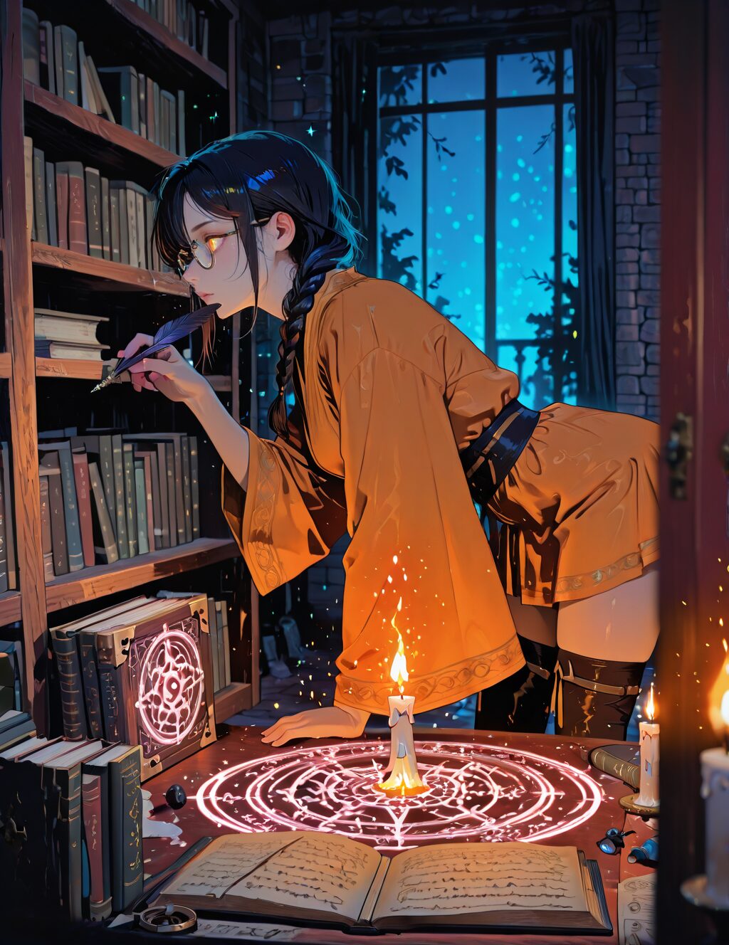spyview,(blurry foreground:1.3),magical girl,casting spell,leaning forward,arm support,grimoire,candle,indoors,bedroom,from above,from side,magic,magic circle,fire,sparkle,sparks,desk,quill,spill,ink,glasses,robe,zettai ryouiki,thigh boots,single braid,hair over shoulder,from outside,bookshelf in foreground,glowing eyes,monocle,loose hair strand,, masterpiece,best quality,amazing quality, very aesthetic, absurdres,ultra-detailed,, against backlight at night,dim lighting, faint lighting, cold colors,dappled moonlight,ray tracing,dynamic lighting,interesting visuals,night,NO_LORA