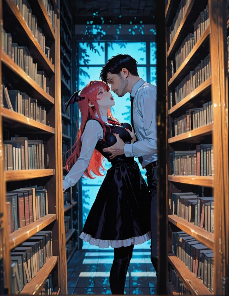 ,spyview,(blurry foreground:1.5),koakuma,dress,implied sex,indoors,library,cowboy shot,hetero,1boy,grabbing another's breast,moaning,, masterpiece,best quality,amazing quality, very aesthetic, absurdres,ultra-detailed,, against backlight at night,dim lighting, faint lighting, cold colors,dappled moonlight,ray tracing,dynamic lighting,interesting visuals,night,,NO_LORA